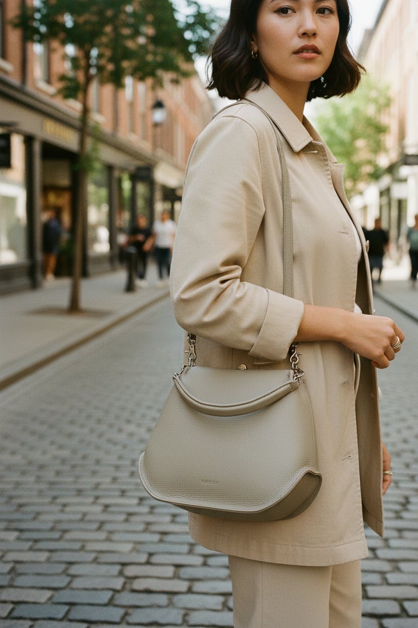 Inspired by the elegant shape of a pear, this handbag features a streamlined silhouette with a unique side and bottom gusset, offering a refreshing, timeless style perfect for any occasion. The flap top, secured by a logo-engraved turn lock, opens to a spacious interior with a convenient pocket for small essentials. A card slot on the back exterior easily fits transit passes from most countries. Carry it by the cushioned handle, or wear it over the shoulder with the optional strap.