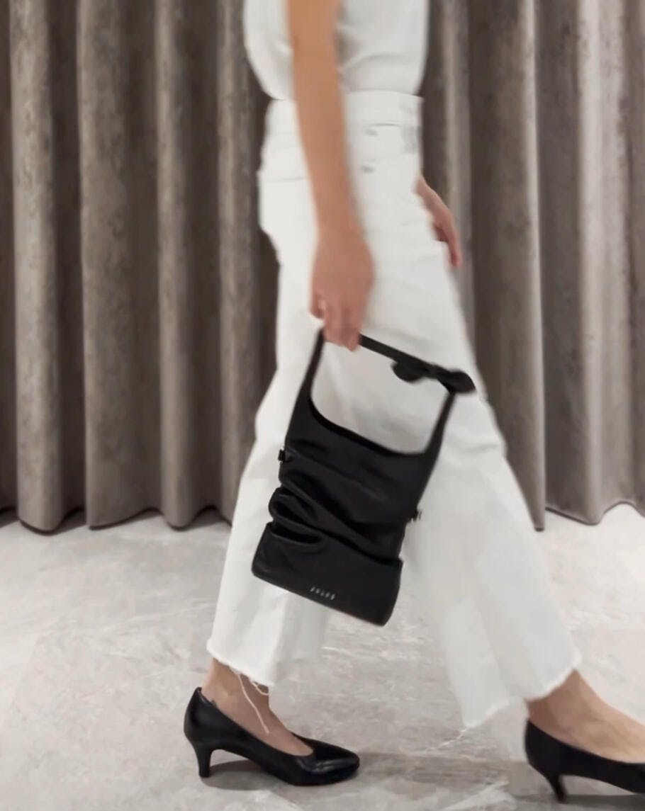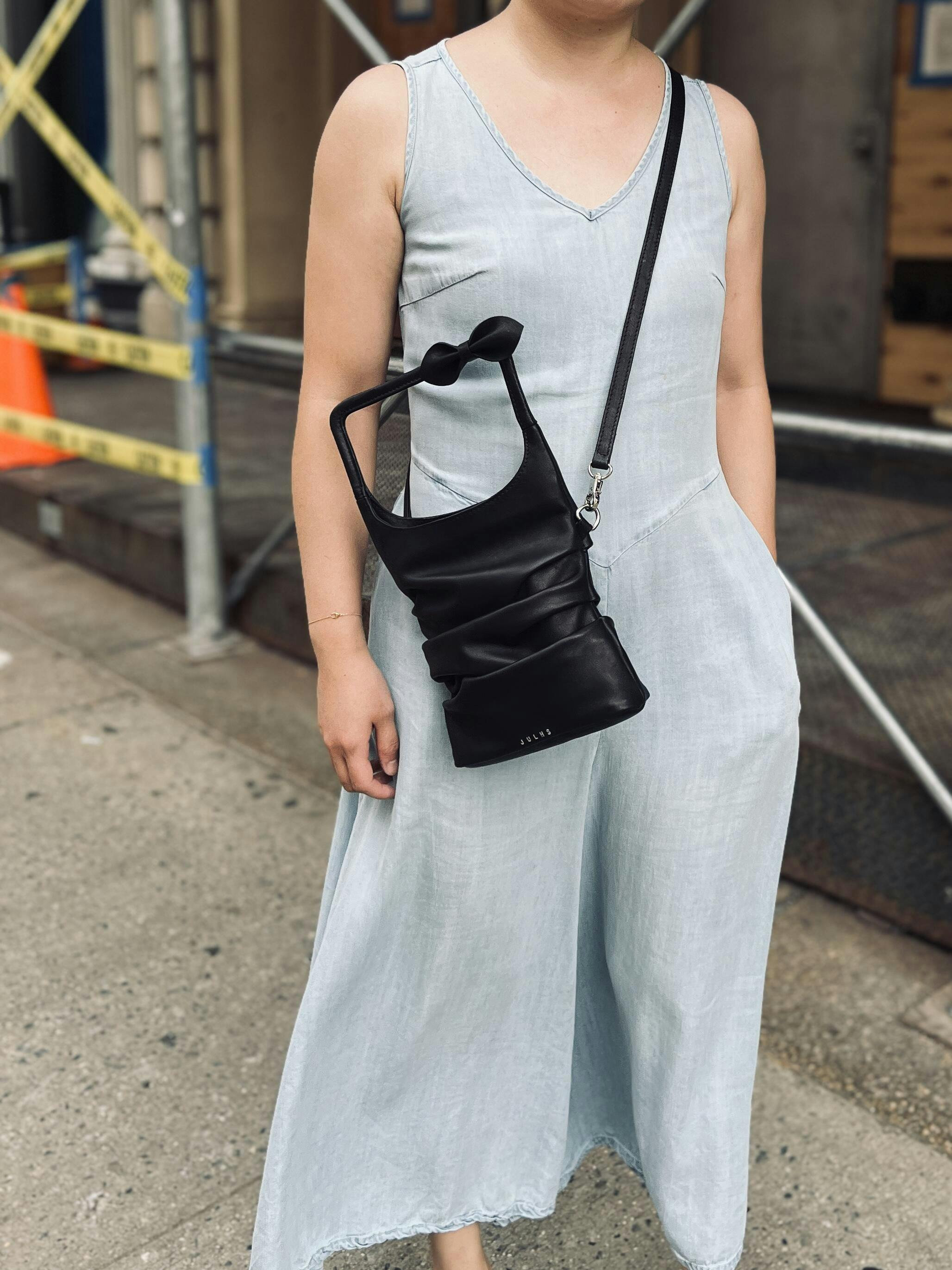 Named for its distinctive D-shaped handle, the Dee origami bag is a masterfully crafted piece of wearable art to elevate any understated ensemble. Pleats on the body are precisely folded and crafted for an organic look. The top loading construction opens to a fabric lined interior with cellphone pocket. The minimalistic bag looks great either handheld by its handle or worn over the shoulder with the detachable strap.